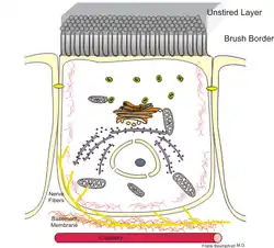 ![]() Schematic drawing of an enterocyte: the intestinal lumen is above the brush border. | |