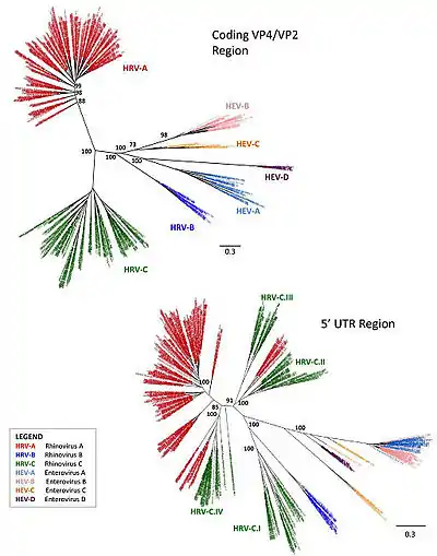 - ↑ Garcia J, Espejo V, Nelson M, Sovero M, Villaran MV, Gomez J, Barrantes M, Sanchez F, Comach G, Arango AE, Aguayo N, de Rivera IL, Chicaiza W, Jimenez M, Aleman W, Rodriguez F, Gonzales MS, Kochel TJ, Halsey ES (October 2013). "Human rhinoviruses and enteroviruses in influenza-like illness in Latin America". Virology Journal. 10: 305. doi:10.1186/1743-422x-10-305. PMC 3854537. PMID 24119298.