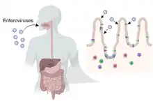 - ↑ Wells, Alexandra I.; Coyne, Carolyn B. (May 2019). "Enteroviruses: A Gut-Wrenching Game of Entry, Detection, and Evasion". Viruses. 11 (5): 460. doi:10.3390/v11050460. PMC 6563291. PMID 31117206.