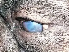 Entropion is a medical condition in which the eyelid (usually the lower lid) folds inward. It is very uncomfortable, as the eyelashes continuously rub against the cornea causing irritation. Entropion is usually caused by genetic factors. This is different from when an extra fold of skin on the lower eyelid causes lashes to turn in towards the eye (epiblepharon).[1] In epiblepharons, the eyelid margin itself is in the correct position, but the extra fold of skin causes the lashes to be misdirected. Entropion can also create secondary pain of the eye (leading to self trauma, scarring of the eyelid, or nerve damage). The upper or lower eyelid can be involved, and one or both eyes may be affected. When entropion occurs in both eyes, this is known as "bilateral entropion". Repeated cases of trachoma infection may cause scarring of the inner eyelid, which may cause entropion.[2] In human cases, this condition is most common to people over 60 years of age.[3]