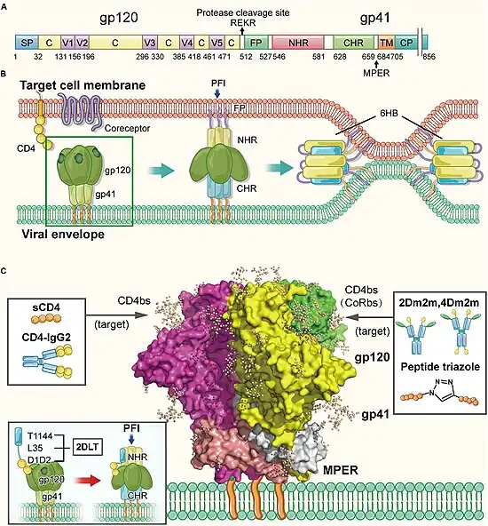 Fusion inhibitor drugs such as enfuvirtide block the fusion process by binding to gp41.[15]