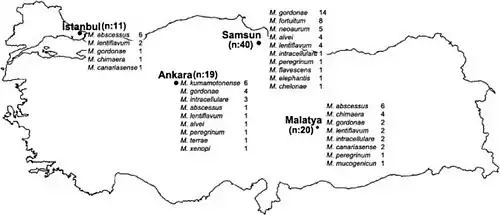 - ↑ De Groote, M. A.; Huitt, G. (2006-06-15). "Infections Due to Rapidly Growing Mycobacteria". Clinical Infectious Diseases. 42 (12): 1756–1763. doi:10.1086/504381. PMID 16705584.