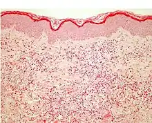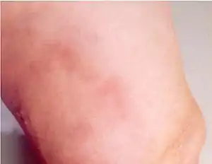 Eosinophilic cellulitis, also known as Wells' syndrome (not to be confused with Weil's disease), is a skin disease that presents with painful, red, raised, and warm patches of skin.[2] The rash comes on suddenly, lasts for a few weeks, and often repeatedly comes back.[2] Scar formation does not typically occur.[1]