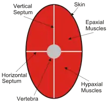 In adult vertebrates, trunk muscles can be broadly divided into hypaxial muscles, which lie ventral to the horizontal septum of the vertebrae and epaxial muscles, which lie dorsal to the septum.[1] Hypaxial muscles include some vertebral muscles, the diaphragm, the abdominal muscles, and all limb muscles. The serratus posterior inferior and serratus posterior superior are innervated by the ventral primary ramus and are hypaxial muscles. Epaxial muscles include other (dorsal) muscles associated with the vertebrae, ribs, and base of the skull. In humans, the erector spinae, the transversospinales (including the multifidus, semispinalis and rotatores), the splenius and suboccipital muscles are the only epaxial muscles.