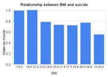 - ↑ Mukamal KJ, Rimm EB, Kawachi I, O'Reilly EJ, Calle EE, Miller M (November 2009). "Body Mass Index and Risk of Suicide Among One Million US Adults". Epidemiology. 21 (1): 82–6. doi:10.1097/EDE.0b013e3181c1fa2d. PMID 19907331. S2CID 10646644.