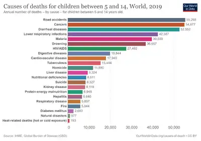 Worldwide it was estimated that 1.25 million people were killed and many millions more were injured in motor vehicle collisions in 2013.[1] This makes motor vehicle collisions the leading cause of death among young adults of 15–29 years of age (360,000 die a year) and the ninth cause of death for all ages worldwide.[2] In the United States, 40,100 people died and 2.8 million were injured in crashes in 2017,[3] and around 2,000 children under 16 years old die every year.[4]
