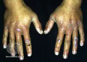 Differential diagnosis | Porphyria cutanea tarda, pemphigoid, pemphigus, dermatitis herpetiformis, drug eruption[3] |