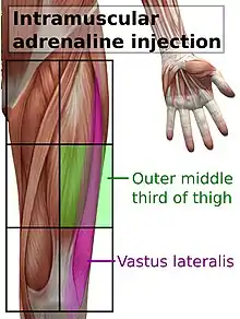 When anaphylaxis is suspected, epinephrine solution should be given as soon as possible as an intramuscular injection, in the middle of the outer side of the thigh, which corresponds to the location of the vastus lateralis muscle.[3] The injection may be repeated every 5 to 15 minutes if there is insufficient response.[4] A second dose is needed in 16–35% of episodes with more than two doses rarely required; in around 80% of the cases where a second dose is administered, it is by a medical professional.[4] It is not clear which are the people who might need a second injection at the outset.[4] The intramuscular route is preferred over subcutaneous administration because the latter may have delayed absorption.[4][5] Minor adverse effects from epinephrine include tremors, anxiety, headaches, and palpitations.[4]