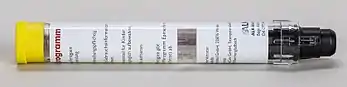 - ↑ Hawkins, SC; Weil, C; Baty, F; Fitzpatrick, D; Rowell, B (September 2013). "Retrieval of Additional Epinephrine from Auto-Injectors". Wilderness & Environmental Medicine. 24 (4): 434–44. doi:10.1016/j.wem.2013.03.025. PMID 24041621.