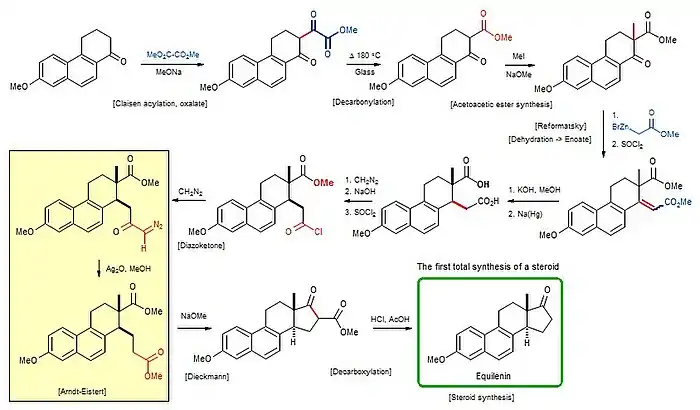 The synthesis developed by the Bachmann group started from Butenand's ketone[4] – the 7-methoxy structural analog of 1,2,3,4-tetrahydrophenanthren-1-one[5] – and which can be readily prepared from 1,6-Cleve's acid.[6] The approach was based on well-established transformations like the Claisen condensation, the Reformatsky reaction, the Arndt–Eistert reaction, and the Dieckmann condensation.[3] Nicolaou described this preparation as ending the era preceding the post-World War II work of Robert Burns Woodward that introduced enantioselective synthesis;[4] in this synthesis, a mixture of stereoisomers were prepared and then resolved,[6] and the choice of target was partly because of the existence of only two chiral carbons and hence only four stereoisomers.[5]