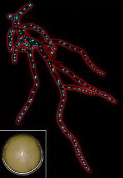 Eremothecium gossypii[1] (also known as Ashbya gossypii[2]) is a filamentous fungus or mold closely related to yeast, but growing exclusively in a filamentous way. It was originally isolated from cotton as a pathogen causing stigmatomycosis by Ashby and Nowell in 1926. This disease affects the development of hair cells in cotton bolls and can be transmitted to citrus fruits, which thereupon dry out and collapse (dry rot disease). In the first part of the 20th century, E. gossypii and two other fungi causing stigmatomycosis (Eremothecium coryli, Aureobasidium pullulans) made it virtually impossible to grow cotton in certain regions of the subtropics, causing severe economical losses. Control of the spore-transmitting insects - cotton stainer (Dysdercus suturellus) and Antestiopsis (antestia bugs) - permitted full eradication of infections. E. gossypii was recognized as a natural overproducer of riboflavin (vitamin B2), which protects its spores against ultraviolet light. This made it an interesting organism for industries, where genetically modified strains are still used to produce this vitamin.