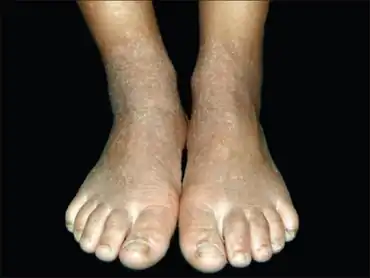 Symmetrical hyperkeratosis with fine scales over both feet, up to the ankle, in the ‘socks’ area