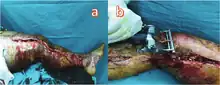 An escharotomy is a surgical procedure used to treat full-thickness (third-degree) circumferential burns. In full-thickness burns, both the epidermis and the dermis are destroyed along with sensory nerves in the dermis. The tough leathery tissue remaining after a full-thickness burn has been termed eschar. Following a full-thickness burn, as the underlying tissues are rehydrated, they become constricted due to the eschar's loss of elasticity, leading to impaired circulation distal to the wound. An escharotomy can be performed as a prophylactic measure as well as to release pressure, facilitate circulation and combat burn-induced compartment syndrome.