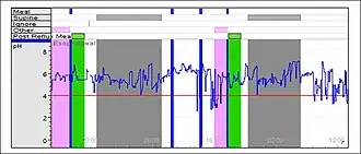 A reflux episode is defined as esophageal pH drops below four. Esophageal pH monitoring is performed for 24 or 48 hours and at the end of recording, a patient's tracing is analyzed and the results are expressed using six standard components. Of these 6 parameters, a pH score called Composite pH Score or DeMeester Score has been calculated, which is a global measure of esophageal acid exposure. A Demeester score > 14.72 indicates reflux.[7]