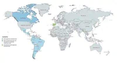 Estradiol enantate has been marketed in combination with DHPA as a combined injectable contraceptive in at least 19 countries, mostly in Latin America.[11][67][28][68][13][12][65][66] A few different preparations, with varying doses of EEn and DHPA and varying availability, have been introduced.[28][11][67][27][23][2][10] These formulations have the following approval and availability († = discontinued in this country):[13][12][65][66][27][28][11][67][2]