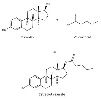 An estrogen ester is an ester of an estrogen, most typically of estradiol but also of other estrogens such as estrone, estriol, and even nonsteroidal estrogens like diethylstilbestrol.[1][2][3] Esterification renders estradiol into a prodrug of estradiol with increased resistance to first-pass metabolism, slightly improving its oral bioavailability.[1][2][4] In addition, estrogen esters have increased lipophilicity, which results in a longer duration when given by intramuscular or subcutaneous injection due to the formation of a long-lasting local depot in muscle and fat.[1][2][3] Conversely, this is not the case with intravenous injection or oral administration.[1][5] Estrogen esters are rapidly hydrolyzed into their parent estrogen by esterases once they have been released from the depot.[1][2] Because estradiol esters are prodrugs of estradiol, they are considered to be natural and bioidentical forms of estrogen.[2][1][6]