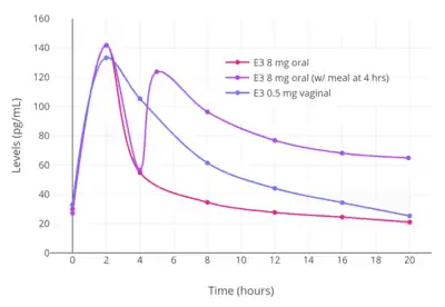 Elimination half-life | Oral: 5–10 hours[9][8] IM : 1.5–5.3 hours (as E3)[5] IV : 20 minutes (as E3)[10][11] |