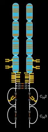 Etanercept is made from the combination of two naturally occurring soluble human 75-kilodalton TNF receptors linked to an Fc portion of an IgG1.[20] The effect is an artificially engineered dimeric fusion protein.[20] Etanercept is a complex molecule containing 6 N-glycans, up to 14 O-glycans and 29 disulfide bridge structures.[21][22][23]
