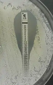 - ↑ Joyce LF, Downes J, Stockman K, Andrew JH (October 1992). "Comparison of five methods, including the PDM Epsilometer test (E test), for antimicrobial susceptibility testing of Pseudomonas aeruginosa". Journal of Clinical Microbiology. 30 (10): 2709–2713. doi:10.1128/JCM.30.10.2709-2713.1992. PMC 270503. PMID 1400972.