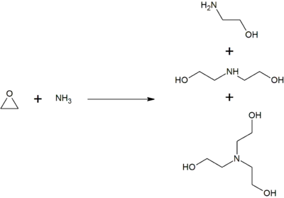 Monoethanolamine is produced by treating ethylene oxide with aqueous ammonia; the reaction also produces diethanolamine and triethanolamine. The ratio of the products can be controlled by the stoichiometry of the reactants.[17]
