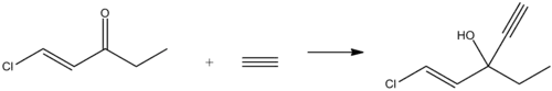 Ethchlorvynol is synthesized by an ethynylation reaction using lithium acetylide and 1-chloro-1-penten-3-one in liquid ammonia, followed by acidic work-up.[4][6]