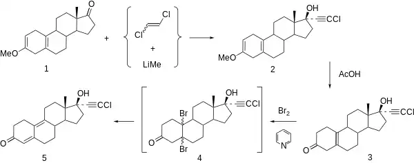 Ethynerone (INN, USAN), also known as 17α-(2-chloroethynyl)estra-4,9-dien-17β-ol-3-one, is a steroidal progestin of the 19-nortestosterone group that was first reported in 1961 but was never marketed.[1] Under the developmental code name MK-665, it was studied in combination with mestranol as an oral contraceptive.[2] Development of the drug was discontinued due to concerns surrounding toxicity findings in dogs.[2] It is a chloroethynylated derivative of norethisterone.[3]