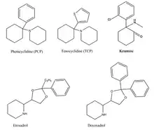 Phenicyclidine (PCP), tenocyclidine (TCP), etoxadrol and its precursor, dexoxadrol have related chemical structures.[6] These drugs all act similarly on the nervous system, acting as dissociative hallucinogens (meaning that they interfere with normal sensory signals, replacing them with hallucinations of any sensory modality) with anesthetic and analgesic properties.