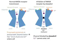 Etoxadrol is a non-competitive NMDA receptor antagonist.[7] It binds with high affinity to the PCP binding site on the NMDA receptor (Ki = 107 nM, determined by the displacement of radiolabeled TCP).[1][3] Normally, the inactivated NMDA receptor possesses a magnesium (Mg2+) block in the channel, blocking the passage of cations.[8]