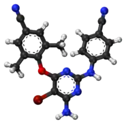 Etravirine is a second-generation non-nucleoside reverse transcriptase inhibitor (NNRTI), designed to be active against HIV with mutations that confer resistance to the two most commonly prescribed first-generation NNRTIs, mutation K103N for efavirenz and Y181C for nevirapine.[11] This potency appears to be related to etravirine's flexibility as a molecule. Etravirine is a diarylpyrimidine (DAPY), a type of organic molecule with some conformational isomerism that can bind the enzyme reverse transcriptase in multiple conformations, allowing for a more robust interaction between etravirine and the enzyme, even in the presence of mutations.[12] Other diarylpyrimidine-analogues are currently being used as anti-HIV agents, notably rilpivirine.
