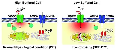 Low Ca2+ buffering and excitotoxicity under physiological stress and pathophysiological conditions in motor neuron (MNs). Low Ca2+ buffering in amyotrophic lateral sclerosis (ALS) vulnerable hypoglossal MNs exposes mitochondria to higher Ca2+ loads compared to highly buffered cells. Under normal physiological conditions, the neurotransmitter opens glutamate, NMDA and AMPA receptor channels, and voltage dependent Ca2+ channels (VDCC) with high glutamate release, which is taken up again by EAAT1 and EAAT2. This results in a small rise in intracellular calcium that can be buffered in the cell. In ALS, a disorder in the glutamate receptor channels leads to high calcium conductivity, resulting in high Ca2+ loads and increased risk for mitochondrial damage. This triggers the mitochondrial production of reactive oxygen species (ROS), which then inhibit glial EAAT2 function. This leads to further increases in the glutamate concentration at the synapse and further rises in postsynaptic calcium levels, contributing to the selective vulnerability of MNs in ALS. Jaiswal et al., 2009.[1]