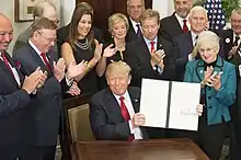 - ↑ Wilts, Alexandra (October 12, 2017). "Donald Trump almost forgets to sign executive order before reminder from Mike Pence". The Independent. London: Independent Print Limited. Retrieved October 12, 2017.
