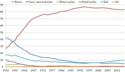 In England, both walking and cycling have declined since 1975 being replaced by motorized transport.[34] The average British citizen in the year 2005 walked 317 km (197 mi) per year,[35] a fall of 106 km (66 mi) since 1975.[34][36]