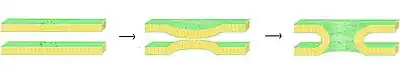 In the lipid-lined pore theory, both membranes curve toward each other to form the early fusion pore. When the two membranes are brought to a "critical" distance, the lipid head-groups from one membrane insert into the other, creating the basis for the fusion pore.