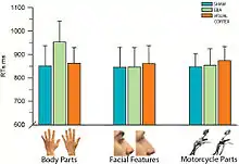 The actual experiment had people make a “two-choice matching-to-sample task. Fourteen right handed participants were required to decide which of two similar upper-limb images matched a single sample previously seen during a tachistoscopic exposure. Photos of face parts and motorcycle parts served as control stimuli in two-matching-to-sample tasks that were comparable to the former task.”[5] rTMS was then applied 150 ms after each sample exposure. The section of the graph, Body Parts, shows the response time while using rTMS. The SHAM category refers to measuring the EBA without rTMS while viewing the images. The Visual Cortex category measures the response of the FFA to be used as the control of the experiment. This measurement of response time, occurring while rTMS was effecting the EBA, further shows that the two areas process visual data of the human form, yet respond to different stimuli. While the magnetic stimulation was temporarily disabling the extrastraite body area, reaction time decreased by about 100 ms. The data from the Sham and Visual Cortex categories on the graph show what was the expected normal results from the experiment. This evidence reveals that applying rTMS to the EBA slowed the response of recognizing images of body parts.[5]