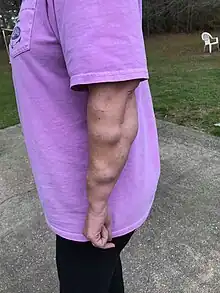 The source of this disease is from family history, and symptoms most often arise in middle age.[2][3] Newly formed lipomas frequently present themselves as a bead-like lump under the skin, and become rubbery and movable.[3] They may be seen throughout the body and in some areas more than others, however, it does not make an appearance on the head or shoulders of the individual.[2] The size of those bumps may vary and could possibly get in the way of an individual living their life peacefully.[2] There are usually no feelings of discomfort or pain unless a lipoma has been aggravated or is directly on a nerve.[4] Lipomas that sit over bony areas such as the ribs and lower back can cause discomfort when lying down or receiving any kind of pressure. The age at which familial multiple lipomatosis begins to make an appearance on the individual’s body varies; for some it may be as early as 5 years of age.[4]