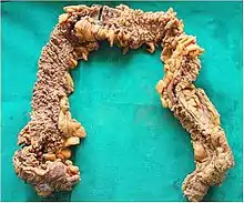 Colectomy specimen showing numerous polyps throughout the large bowel