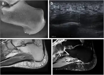 a) Plantar fasciitis x-ray, b) ultrasound, c,d) MRI