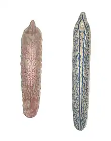 Cobbold's drawings of dorsal (left) and ventral views of Fasciola gigantica | |