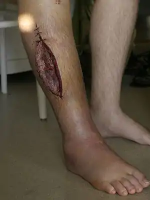 - 1 2 Dente CJ, Wyrzykowski AD, Feliciano DV (October 2009). "Fasciotomy". Current Problems in Surgery. 46 (10): 779–839. doi:10.1067/j.cpsurg.2009.04.006. PMID 19735797.