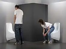 In the course of the development towards unisex toilets, designers and developers are increasingly faced with the challenge of creating gender-appropriate solutions. Models, like "Uni-Pee" designed by Tamar Dax,[35][lower-alpha 1] "We P" designed by Michal Farago,[36][lower-alpha 1] "MissWizz" from Ellen Lejeune,[37][lower-alpha 1] "UriLift" from Pop-Up Toilet Company,[38] "Captain" by Uridan,[39] "Ti'Pi" by Ves Bat Eco,[40][lower-alpha 2] "Weestand"[41][lower-alpha 1] by LiquidGold,[42] and "Urin*all" in collaboration with the Swiss sanitary technology company Urimat,[43][lower-alpha 1] have been developed that can be used comfortably by females and males alike.[44][45] Urin*all was developed 2022 by two Swiss industrial designers at the FHNW School of Art and Design in Basel. Women use the front part while men use the rear area, so that facilities for fast and contactless urination are available to people of any gender - thereby enabling more gender equality in public space. The urinal also requires no water and can collect phosphorus, which serves as fertilizer for plants. The all-gender urinal has now been awarded the public prize by Valoo, the Swiss network for sustainable sanitary systems and is currently further developed in collaboration with the Swiss sanitary technology company Urimat.[43][46][47]