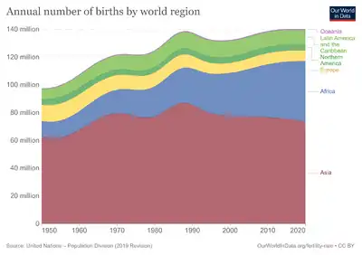 - ↑ CDC Bottom of this page https://www.cdc.gov/nchs/products/vsus.htm Archived 2022-06-21 at the Wayback Machine "Vital Statistics of the United States, 2003, Volume I, Natality", Table 1-1 "Live births, birth rates, and fertility rates, by race: United States, 1909-2003."