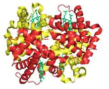 ![]() Structure of fetal hemoglobin (HbF). The 2α and 2γ subunits are in red and yellow, respectively, and the iron-containing heme groups in green. From PDB: 4MQJ, by authors Soman, J. and Olson J.S. | ||||||||||||||||