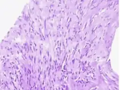 Fibroblastic and myofibroblastic tumors (FMTs) develop from the mesenchymal stem cells which differentiate into fibroblasts (the most common cell type in connective tissue) and/or the myocytes/myoblasts that differentiate into muscle cells. FMTs are a heterogeneous group of soft tissue neoplasms (i.e. abnormal and excessive tissue growths). The World Health Organization (2020) defined tumors as being FMTs based on their morphology and, more importantly, newly discovered abnormalities in the expression levels of key gene products made by these tumors' neoplastic cells.[1] Histopathologically, FMTs consist of neoplastic connective tissue cells which have differented into cells that have microscopic appearances resembling fibroblasts and/or myofibroblasts. The fibroblastic cells are characterized as spindle-shaped cells with inconspicuous nucleoli that express vimentin, an intracellular protein typically found in mesenchymal cells, and CD34, a cell surface membrane glycoprotein. Myofibroblastic cells are plumper with more abundant cytoplasm and more prominent nucleoli; they express smooth muscle marker proteins such as smooth muscle actins, desmin, and caldesmon.[2] The World Health organization further classified FMTs into four tumor forms based on their varying levels of aggressiveness: benign, intermediate (locally aggressive), intermediate (rarely metastasizing), and malignant.[1]