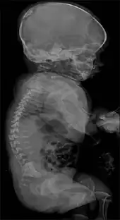 Other prominent features include dwarfism,[1] shortened ribs that have a concave appearance,[6] micrognathism (severely underdeveloped jaw),[7] macrocephaly (enlarged head),[8] thoracic hypoplasia (underdeveloped chest),[8] enlarged stomach,[8] platyspondyly (flattened spine),[6] and the somewhat uncommon deformity of bifid tongue (in which the tongue appears split, resembling that of a reptile).[7]
