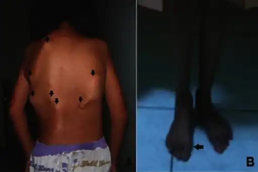 - ↑ Obamuyide, HA; Ogunlade, SO (March 2015). "A Tumour for which Surgery will do more harm than good: A Case Report of Fibrodysplasia Ossificans Progressiva". The Nigerian Postgraduate Medical Journal. 22 (1): 83–8. PMID 25875418. ProQuest 1850178336.