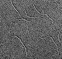 Filamentous bacteriophages are a family of viruses (Inoviridae) that infect bacteria, or bacteriophages. They are named for their filamentous shape, a worm-like chain (long, thin and flexible, reminiscent of a length of cooked spaghetti), about 6 nm in diameter and about 1000-2000 nm long.[1][2][3][4][5] This distinctive shape reflects their method of replication: the coat of the virion comprises five types of viral protein, which are located in the inner membrane of the host bacterium during phage assembly, and these proteins are added to the nascent virion's DNA as it is extruded through the membrane. The simplicity of filamentous phages makes them an appealing model organism for research in molecular biology, and they have also shown promise as tools in nanotechnology and immunology.