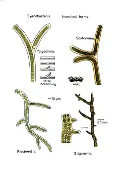 - ↑ Nürnberg, Dennis J.; Mariscal, Vicente; Parker, Jamie; Mastroianni, Giulia; Flores, Enrique; Mullineaux, Conrad W. (2014). "Branching and intercellular communication in the Section V cyanobacterium Mastigocladus laminosus, a complex multicellular prokaryote". Molecular Microbiology. 91 (5): 935–949. doi:10.1111/mmi.12506. hdl:10261/99110. PMID 24383541. S2CID 25479970.