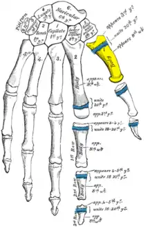 - Dorsal view of the left hand (first metacarpal shown in yellow).