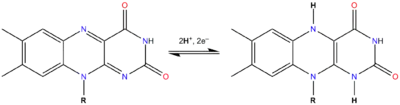 In aqueous solution, flavins are yellow-coloured when oxidized, taking a red colour in the semi-reduced anionic state or blue in the neutral (semiquinone) state, and colourless when totally reduced.[1] The oxidized and reduced forms are in fast equilibrium with the semiquinone (radical) form, shifted against the formation of the radical:[2]