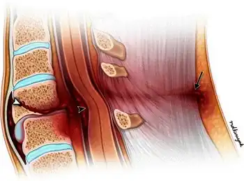 A flexion teardrop fracture is a fracture of the anteroinferior aspect of a cervical vertebral body due to flexion of the spine along with vertical axial compression.[1] The fracture continues sagittally through the vertebral body, and is associated with deformity of the body and subluxation or dislocation of the facet joints at the injured level.A flexion teardrop fracture is usually associated with a spinal cord injury, often a result of displacement of the posterior portion of the vertebral body into the spinal canal.[2]